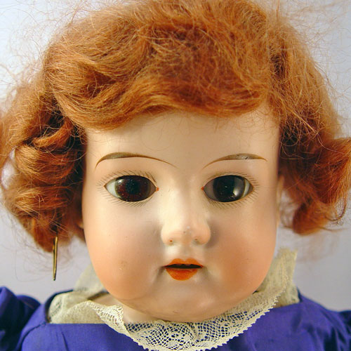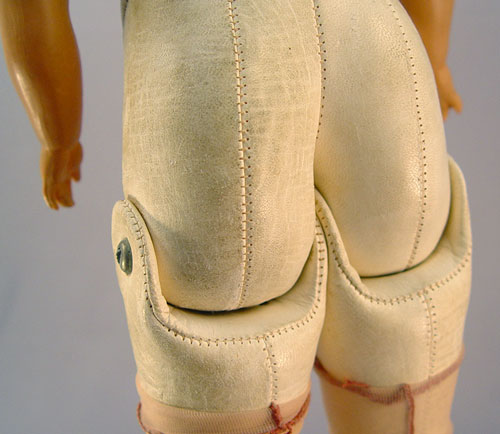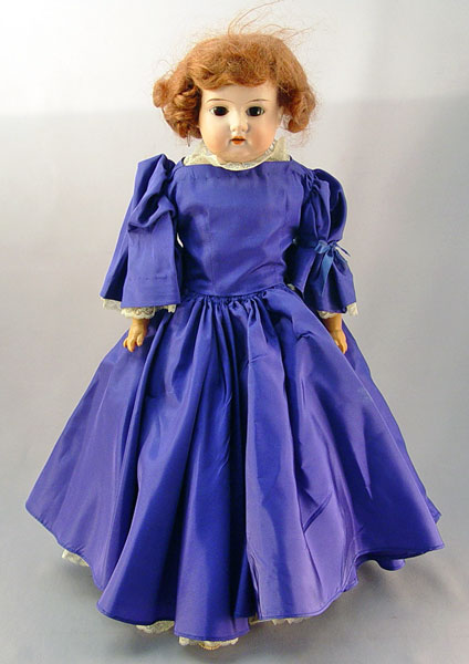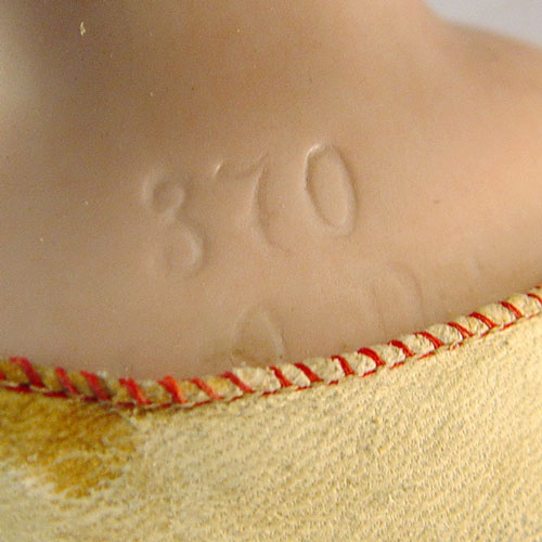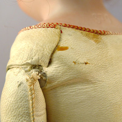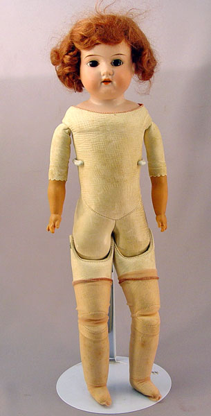BISQUE PORCELAIN SHOULDER HEAD DOLL: Brown glass open eyes, open mouth with teeth. Marked 870, partial marks visible under kid leather. Kid leather body and legs, hard plastic hands. 19'' long.