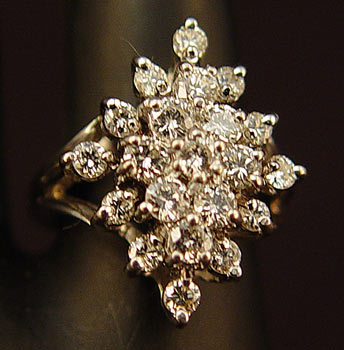 21 STONE DIAMOND WATERFALL RIGHT HAND RING: 14k white gold set with 21 diamonds, approx. 1.5 ctw. 5.1 grams. All stones are prong set. Size 4.