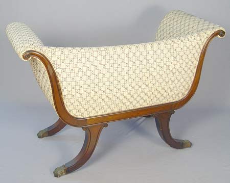 DIMINUTIVE DUNCAN PHYFE STYLE SETTEE: Carved mahogany frame, 27 1/2''h. x 41'' wide x 17'' deep.