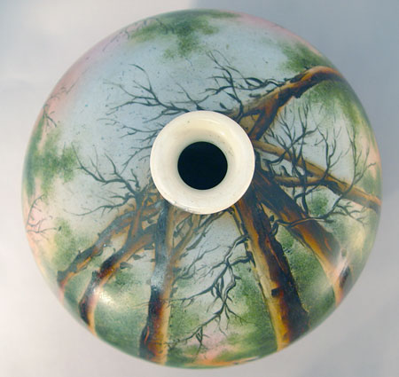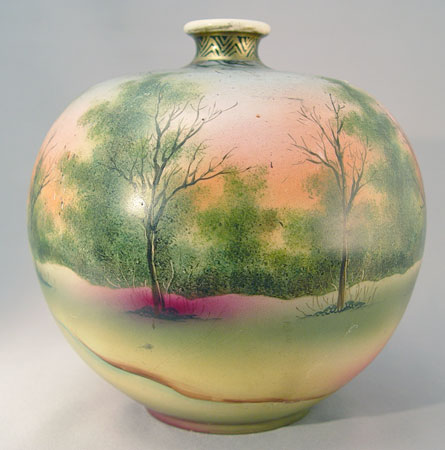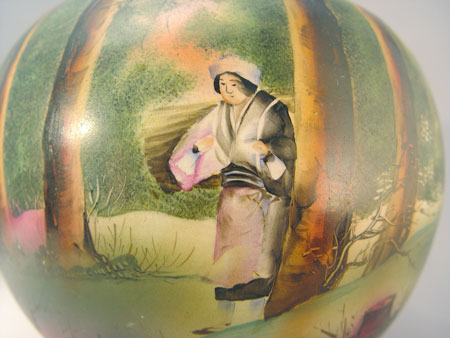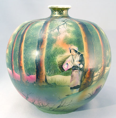 HAND PAINTED ROYAL NIPPON VASE: Hand painted image of woman walking through the forest. Royal Nippon mark, 8''h, 8'' dia. overall. Please note wear to the gold on the rim.