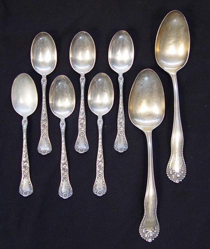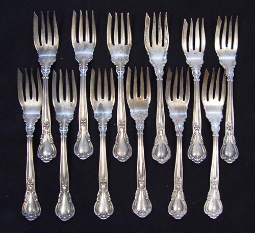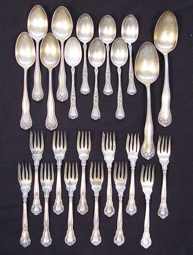 24 PIECE GORHAM STERLING FLATWARE LOT: 24 pieces to include Chantilly pattern 12 fish forks (5 3/4''), 6 Lancaster pattern serving and table spoons (8 3/8'' & 7''), 6 Marguerite pattern teaspoons (5 7/8''). All monogrammed. Approx. 23 troy oz.