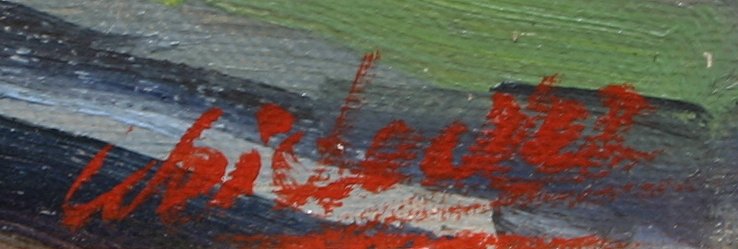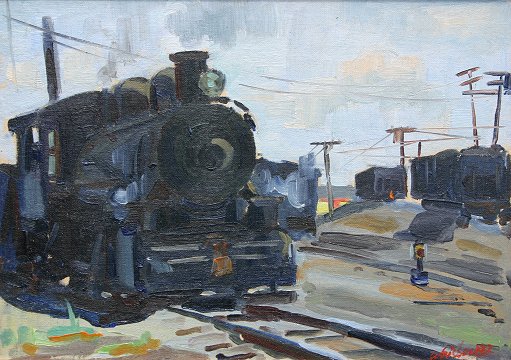 WPA ERA TRAIN LOCOMOTIVE PAINTING: Oil/Canvas Board, 10'' x 14'', illegibly signed Weidinger?, framed, 14'' x 18''.