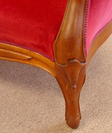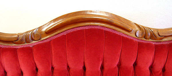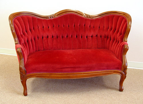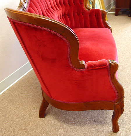 PETITE PERIOD VICTORIAN ROCOCO SETTEE: Curved top rail, button and tufted velvet fabric. Excellent condition for shop or home. 33''h. x 54'' long x 24'' deep.