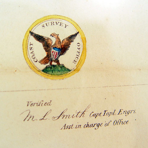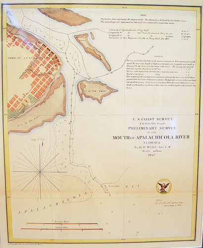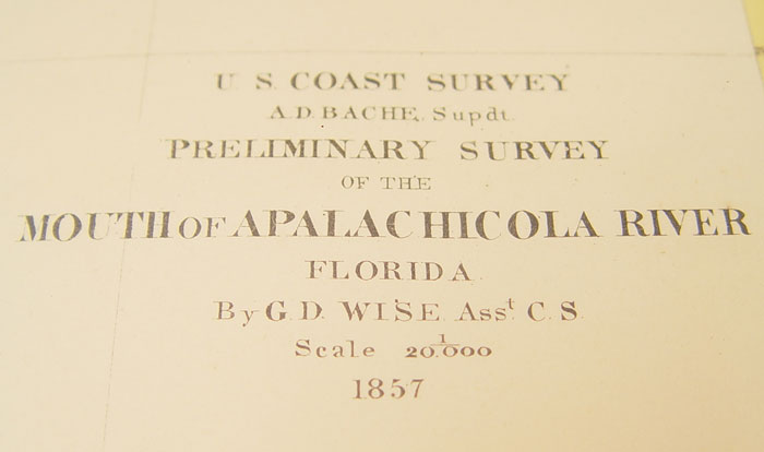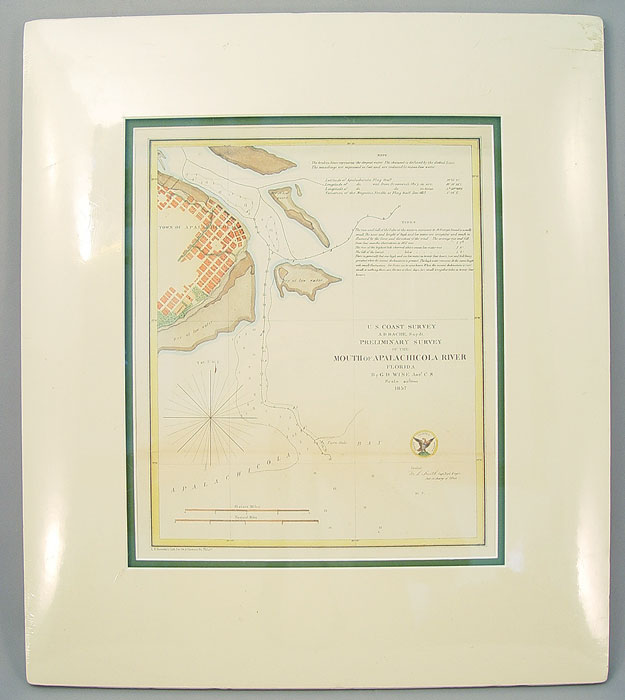 1857 MAP OF MOUTH OF APALACHICOLA RIVER FLORIDA: 1857 dated US Coast Survey map of the Mouth of Apalachicola River in Florida by G.D Wise. Published by Rosenthal's Litho Co. Philadelphia. Sight size 8 1/2'' x 10''. Matted measures 15'' x 17 1/4''. Please note fold.