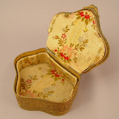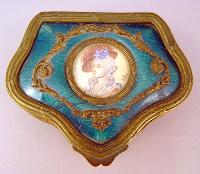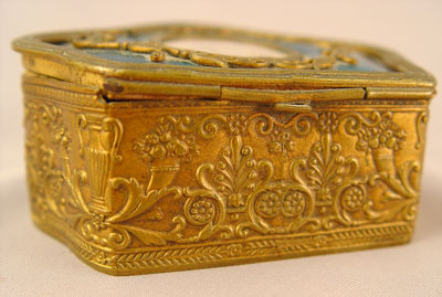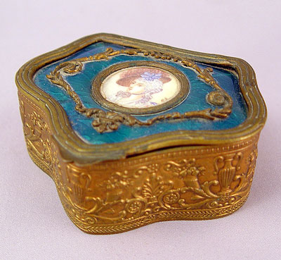 GUILLOCHE DRESSER BOX WITH HAND PAINTED MINIATURE PORTRAIT: Repousse brass box, the lid centered by a hand painted miniature portrait signed Silvy. Original lined interior. 1 3/8''h. x 4 1/2'' x 3''.