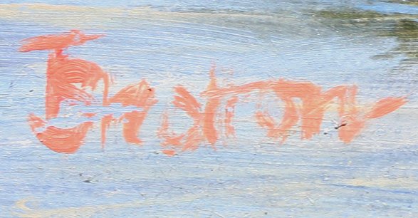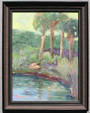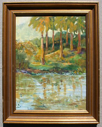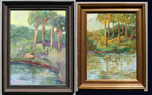 TWO TROPICAL LANDSCAPES WITH PALM TREES: Oil/Masonite, 16'' x 12'', illegibly signed T. Shotton?, both signed, framed, 18 1/2'' x 14 1/2''. Several scrapes and abrasions with minor paint loss.