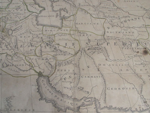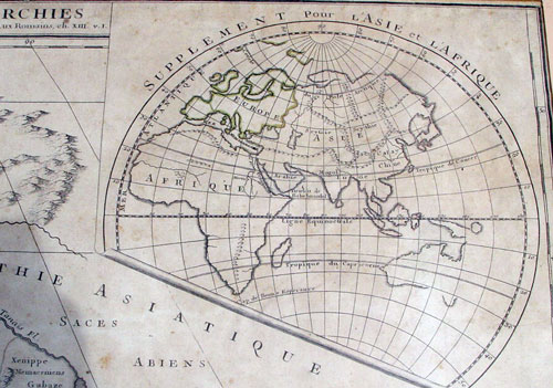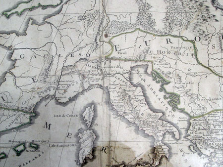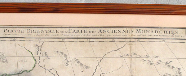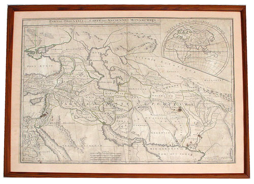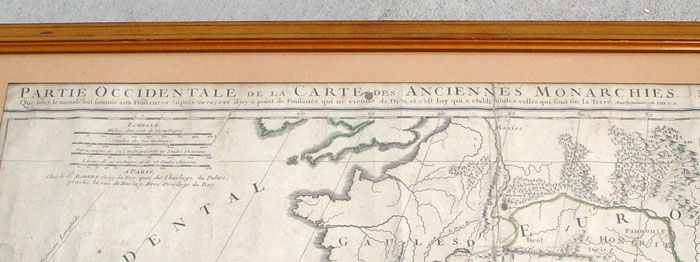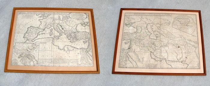 PAIR FRENCH 18TH CENTURY EUROPEAN MONARCHIES MAPS: Circa 1760 French pair of maps depicting ancient monarchies of Europe and Eurasia. Titled ''Partie Occidentale de la Carte des Anciennes Monarchies'' and '' Partie Oriental de la Carte des Anciennes Monarchies''. Sight size 25 1/2'' x 20'', 25'' x 19 1/4''. Contemporary wood frames 29 1/4'' x 23 1/2'', 28 3/4'' x 23''. Please note foxing, folds, minor area of paper loss and stains.