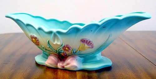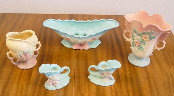5 PIECE COLLECTION OF HULL POTTERY: 1) ''Wildflower'', W-9-8 inches. 2) ''Wildflower'', W-5-6 1/2 inches 3) ''Bow-Knot'' console bowl, B-16-13 1/2 inches 4-5) ''Bow_Knot'' 4 inch candle holders.