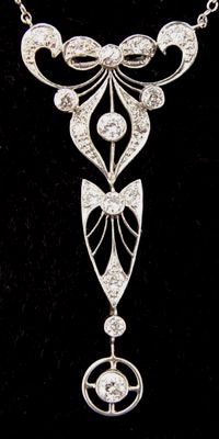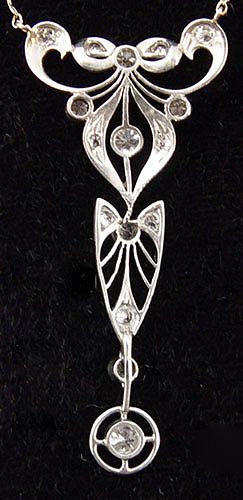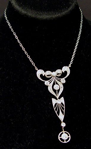 PLATINUM AND DIAMOND LAVALIERE NECKLACE: Platinum lavaliere necklace with 16 old European round and round full cut diamonds. .75 CTW Approx, rated SI in clarity and H-I in color. The diamonds are prong and bezel set. Pendant is approx 2''. Platinum fine rope chain. Approx. 16'' overall. Weight: 5.4 grams.