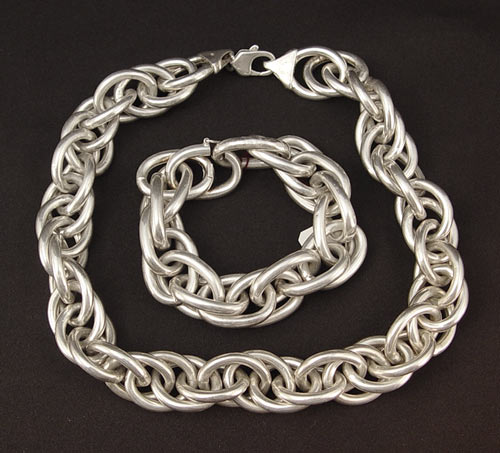 CHUNKY ITALIAN STERLING LINK BRACELET AND NECKLACE: Statement making twosome. The neck chain is 17 1/2'' in length, bracelet is 8 1/2''. Stamped Italy, 925, and sterling. Approx. 5.785 troy oz.