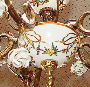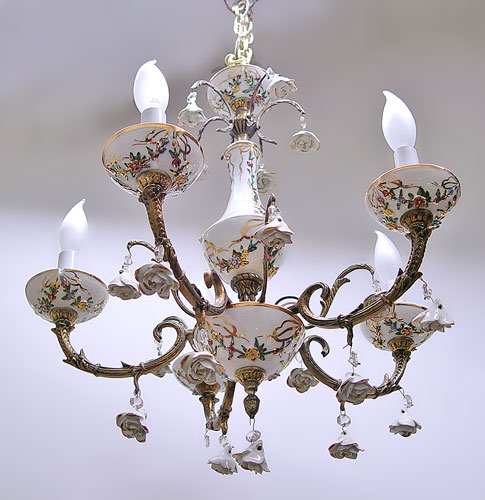 ITALIAN PORCELAIN CHANDELIER: 5 lights, with porcelain rose drops, 18'' high x 18'' wide. Please note loss of 2 roses.