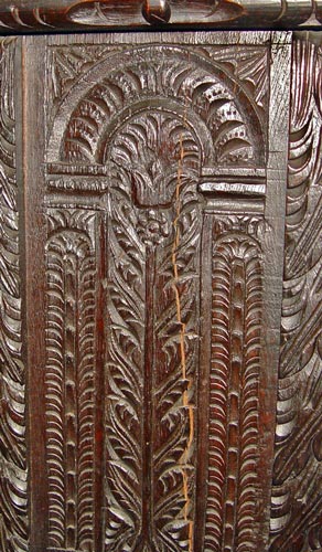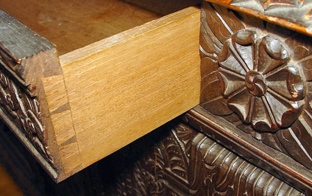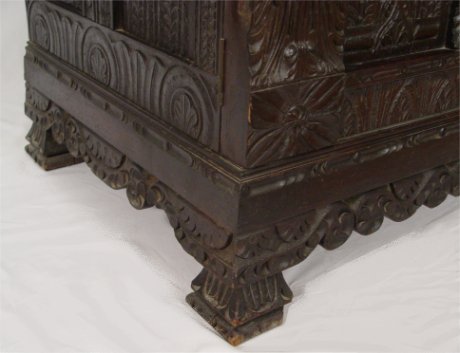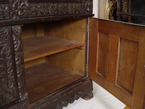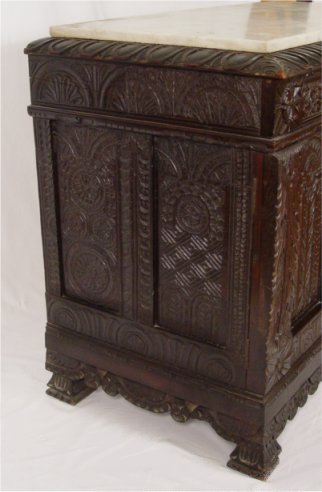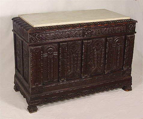 HEAVILY CARVED EARLY ENGLISH SIDE CABINET: Two drawer over two door carved to death oak cabinet fitted with a white marble top, please note a couple of age cracks to doors. 34''h. X 49'' X 23''.