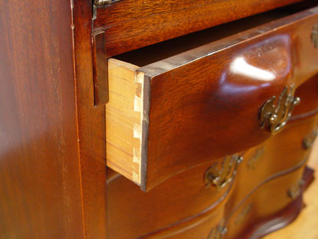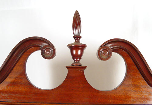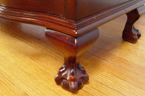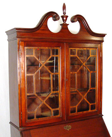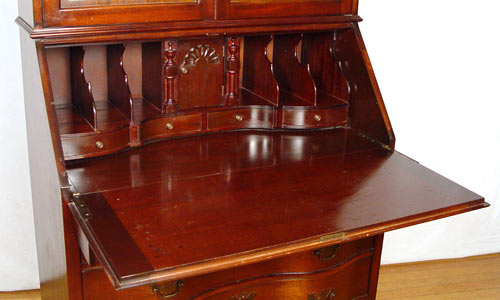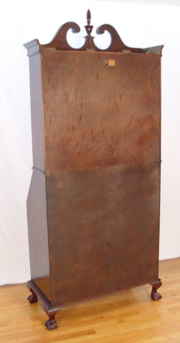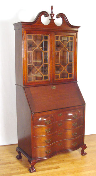MADDOX MAHOGANY BOOKCASE SECRETARY: Upper section glass front bookcase / china cabinet. Lower section slant front desk, interior pigeon holes and drawers. 4 full length serpentine front drawers, claw and ball feet. Approx. 85'' high x 34 1/2'' wide x 18'' deep overall.