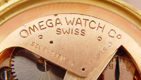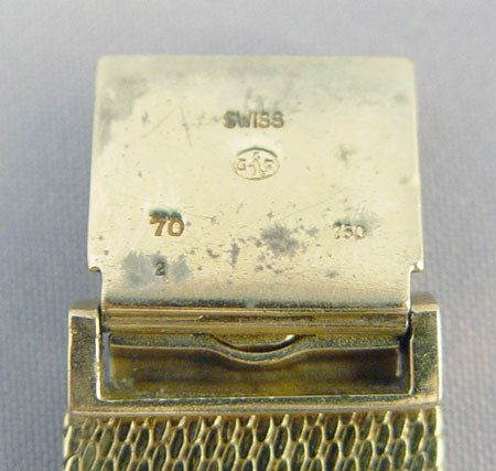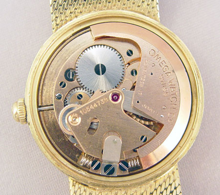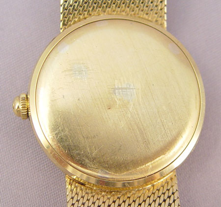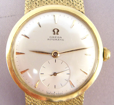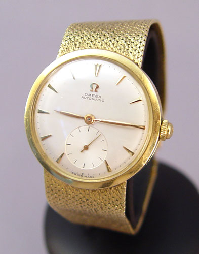GENTLEMAN'S OMEGA 18K WRIST WATCH: Automatic movement, serial #10544738, 18k yellow gold case and bracelet, serial #10705128, 7 1/4'' mesh band with slight warp, adjustable length clasp marked 750 70 Swiss G F in oval with deer?, scratches to back and small dents to sides of case, Omega mark to dial works stem and case. 76.7 grams including works.