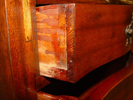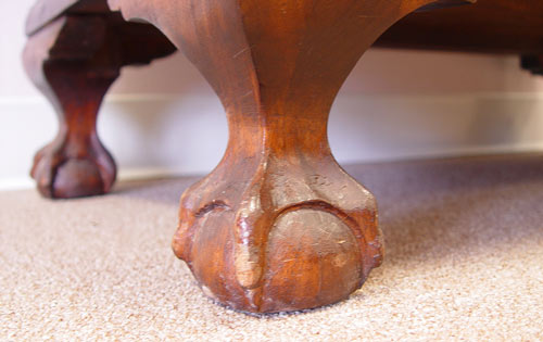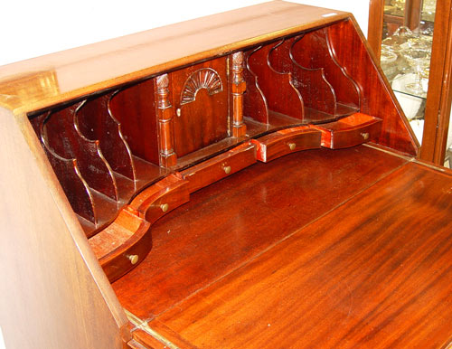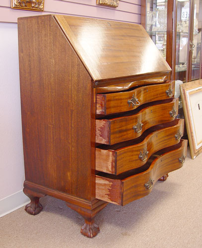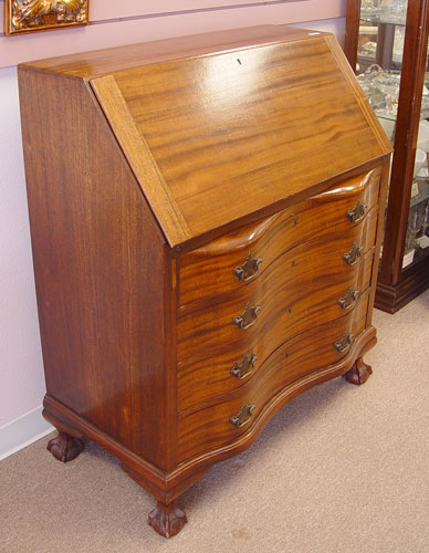 FINE MAHOGANY GOVERNOR WINTHROP DESK: Four drawer serpentine slant front desk, interior fitted with cubicles and drawers. 4 carved ball and claw feet. 42''h. x 36'' x 19''.