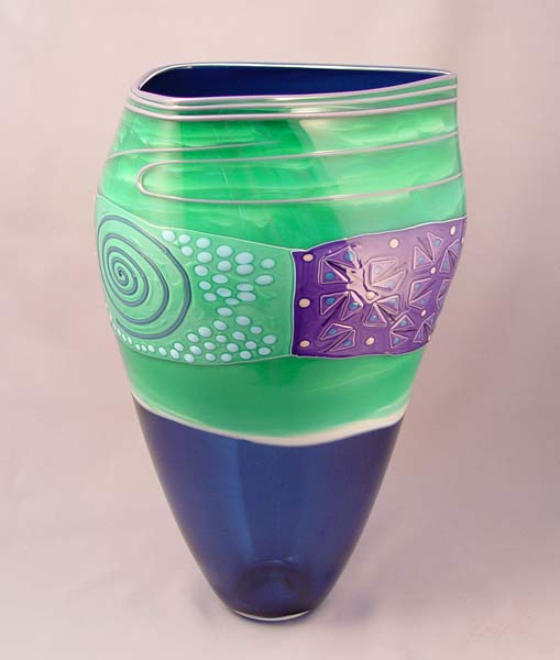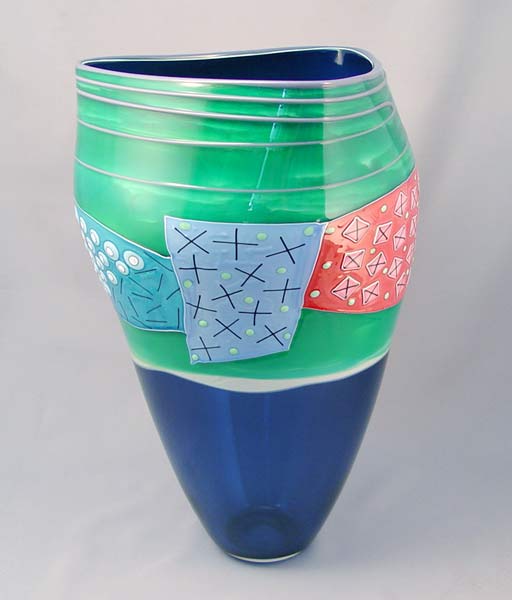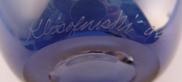 KLISZEWSKI GLASS CARIBBEAN BLUE SHARD VESSEL: From the glass blowing studio of California artists Bob and Laurie Kliss. 14 3/4''h., 8 1/2'' dia. at the rim. Signed ''Klizewski '95''.