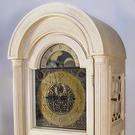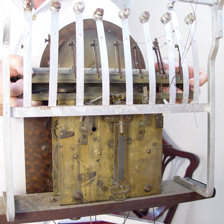 COLONIAL GRANDFATHER CLOCK: Permafinished mahogany case by Colonial Mfg, German works, choice of three chimes or silent, nine chrome tubes with new string, new string to hammers, three weights and pendulum. Measures 6' 3'' tall x 20'' wide x 15 1/4'' deep. Sold as-is.