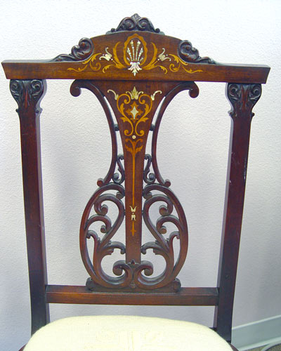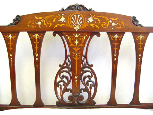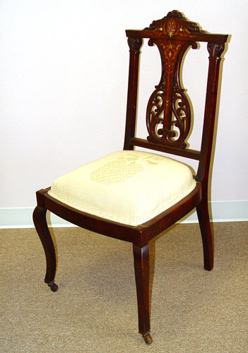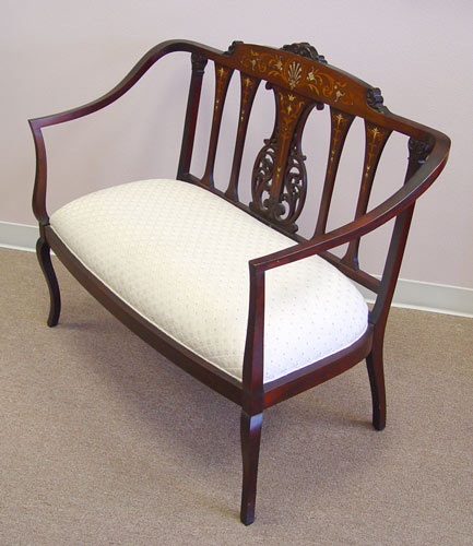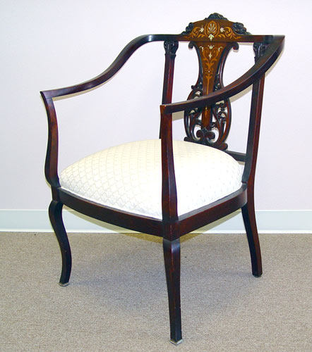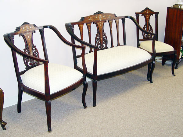 3 PIECE EDWARDIAN MOTHER OF PEARL INLAY PARLOR SUITE: Mother of pearl and marquetry inlay. Open arm settee, open arm chair and side chair. The side chair is in needlepoint, the settee and arm chair are newly upholstered. Excellent condition. Settee is 36 1/2'' x 44'' x 22''.