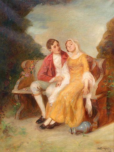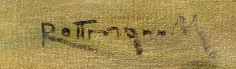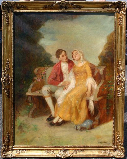ROTTMANN, Mozart, (European, 19th C): Courting Scene, Oil/Canvas, 32'' x 23 3/4'', signed, encased in gilded frame with minor wear, 35 1/2'' x 28''. Several pin holes, needs cleaning.