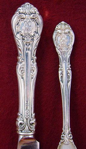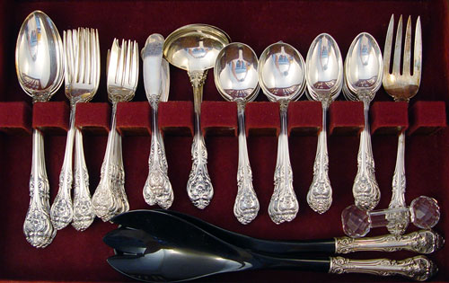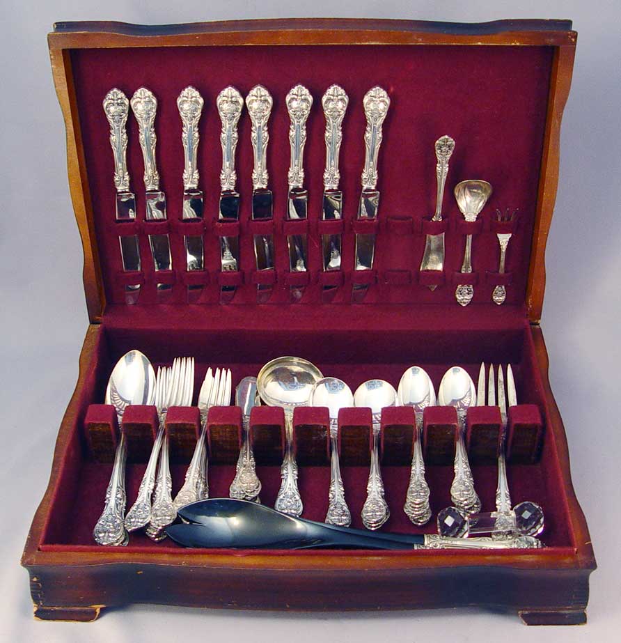 68 PIECES GORHAM KING EDWARD STERLING FLATWARE: Gorham King Edward pattern 68 pieces to include: 8 dinner forks (7 1/8''), 8 salad forks (6 1/4''), 18 teaspoons (6''), 8 soup spoons (6 1/4''), 8 dinner knifes (9 7/8''), 8 butter knifes (5 7/8''), master butter knife (6 7/8''), 2 gravy ladles (6 1/2''), 3 serving spoons (8 1/2''), serving fork (8 1/8''), 2 piece salad serving set (11 3/4''), scalloped small serving spoon (5 3/4''), lemon fork (4 3/8''), jelly server (6 1/4''). Set in wood box, please note condition of box. Approx. 77.6 troy oz.