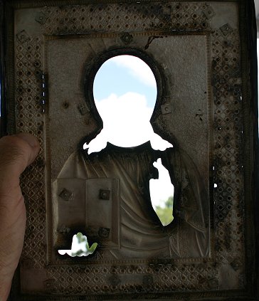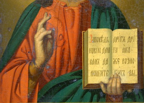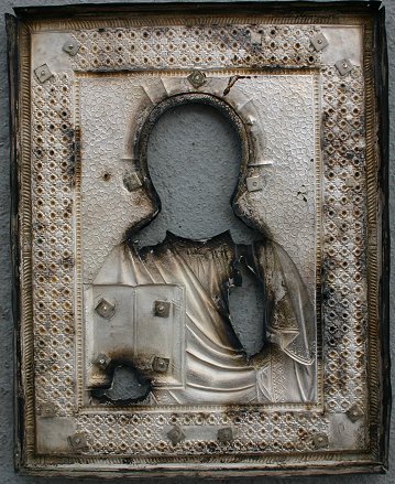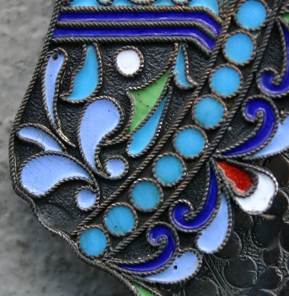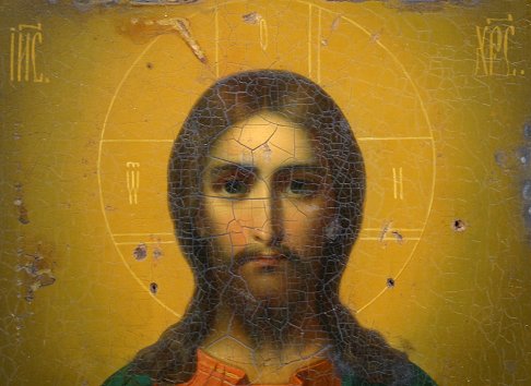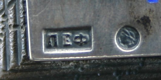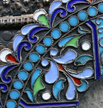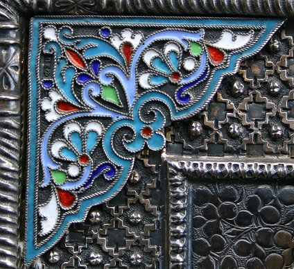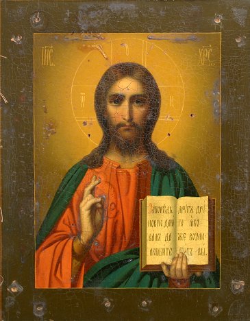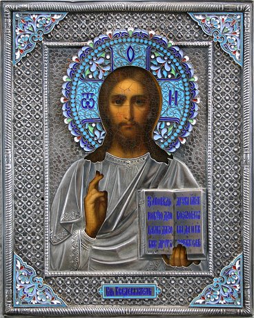 IMPRESSIVE FABERGE QUALITY RUSSIAN ENAMELED SILVER OKBLAD/ICON CHRIST PANTOCRATOR: Hallmarked 7 times, assayer's mark dates it to 1896-1905 in the Kostroma region, 9'' x 7''. Good condition, photos show several small cracks and areas of missing silver. Painting on wood is good, several minor abrasions.