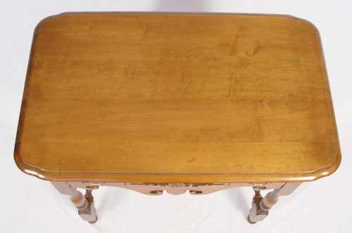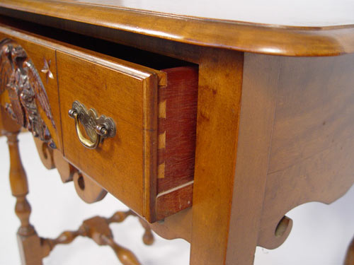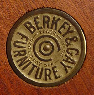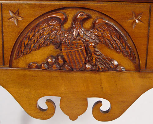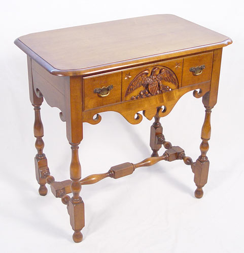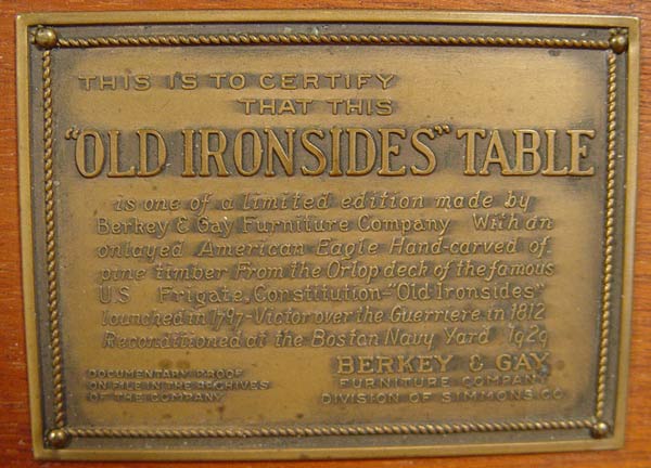 1929 BERKEY & GAY ''OLD IRONSIDES'' SIDE TABLE: Single drawer side table, only 100 of these were made. Plaque inside drawer certifies limited edition with onlayed American eagle hand carved from the deck of the US Frigate Constitution, launched in 1797 and recondition at the Boston Navy Ship yard 1929. Also has Berkley & Gay metal tag inside drawer. Measures 29 1/4'' tall, 30 1/4'' x 18 3/4''.