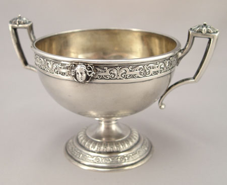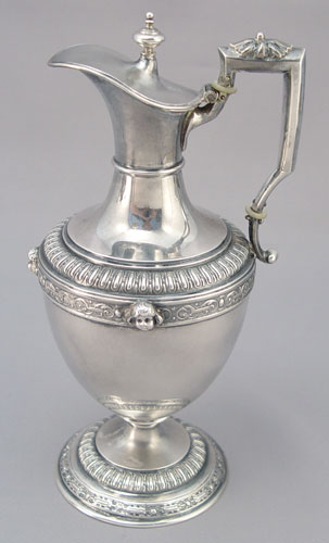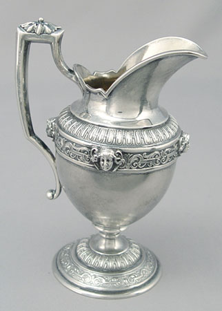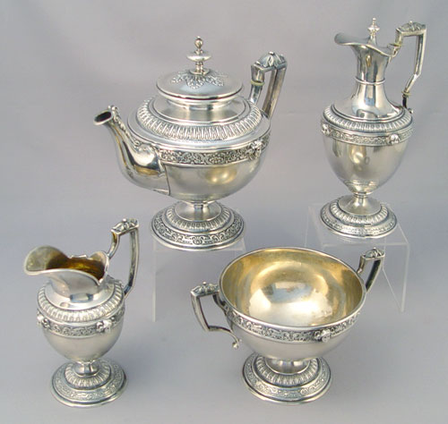 4 PIECE RUSSIAN SILVER TEA SET: Backstamp ''84'' along with ''Freytag''. Masqueron decorated 4 piece set to include pot with hinged lid, 7'' tall, open sugar, and ewer shaped cream pitcher with hinged lid, 7 1/2'' tall, and a open cream pitcher 5 5/8'' high. Approx. 42.7 troy oz.