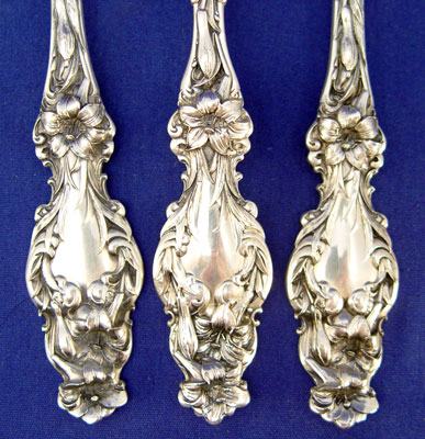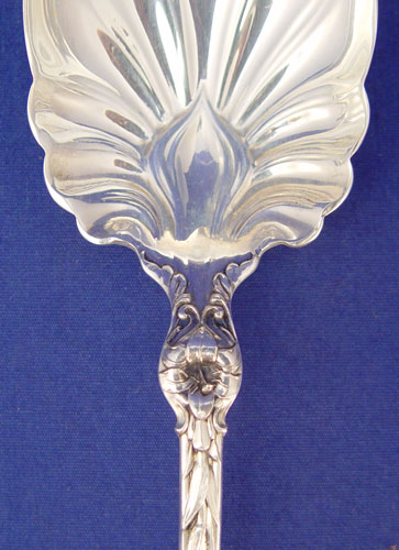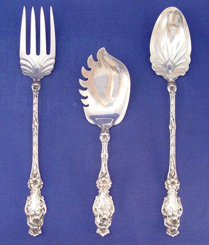 3 WHITING ''LILY'' STERLING SERVING PIECES: 1) Oversize solid salad serving spoon, 11 1/2'' long 2) Oversize solid salad serving fork 11 1/2'' long 3) solid macaroni server, 9'' long. Approx. 14.33 oz.