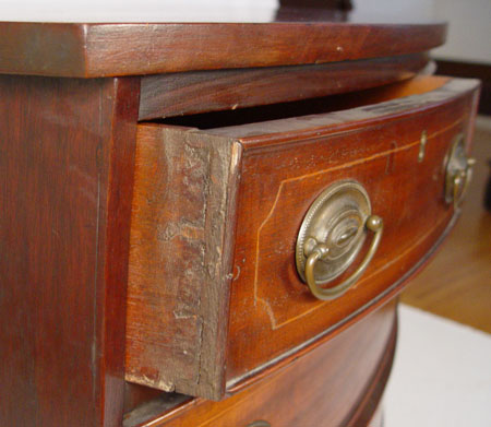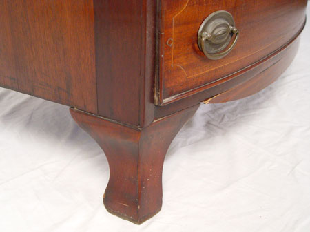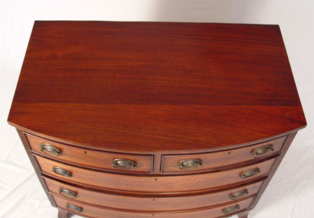 19TH CENTURY MAHOGANY HEPPLEWHITE STYLE BOWFRONT CHEST: 2 drawers over 3 full length drawers. Each drawer with string inlay and framed in molding. Measures 34 1/2'' high x 37 3/4'' wide x 22'' deep.