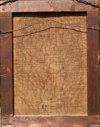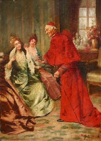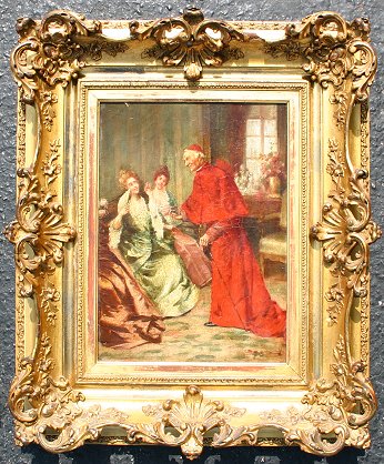 19TH C GENRE PAINTING OF CATHOLIC CARDINAL AMUSING SEVERAL LADIES IN AN INTERIOR SCENE: Oil/Canvas, 14'' x 10 1/2'', signed lower right Genta?, encased in a period gilded and pierce carved molding with missing gesso scattered throughout, 22'' x 19''. Painting needs cleaning, several areas of cracklure and has been cut down.