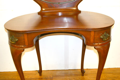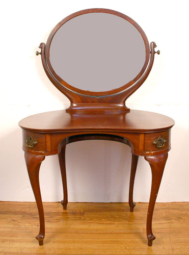 SOLID MAHOGANY DRESSING TABLE VANITY: Oval mirror pivots and swings. 2 side drawers are half circle in shape. The top is kidney shape. Queen Anne legs. Measures 56'' high x 36'' wide x 26'' deep. Please note pry marks at bottom of drawers.
