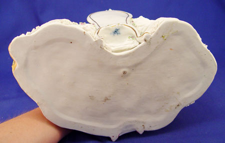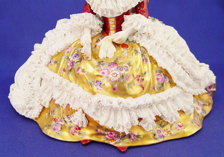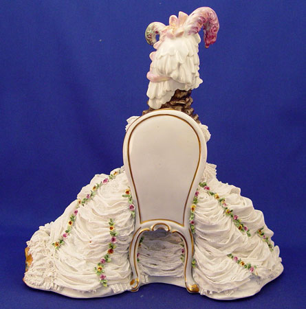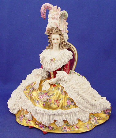 OUTSTANDING GERMAN PORCELAIN LACY FIGURE OF A GRAND LADY WITH OLDEST VOLKSTEDT MARK: Seated on a chair, dressed in a gown of layers of lace and floral decorated gilt skirt. Plumed headdress. Marked under the chair. 11''h. 11'' wide.