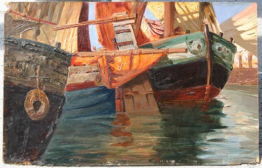 COMELLI, Dante, (Italian, 1880-1958): Boats at the Dock, Oil/Board, 6 3/4'' x 10 1/2'', signed verso, encased in ebonized frame, 11'' x 15''. Three of the corners are slightly dog eared, several flecks of missing paint in the left quadrant.