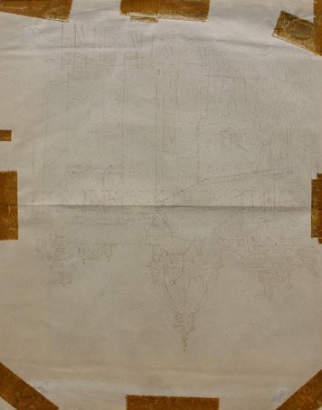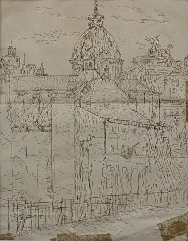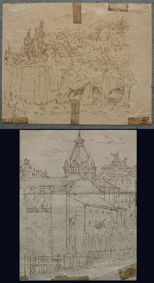 TAMBURI, Orfeo, (Italian, 1910-1994): Pair of drawings, 1) Cemetery landscape, 11'' x 13 1/2'', signed, illegibly titled and dated 1934, several old scotch tape repairs. Sold as is. 2) Pond Scene ''Basilica di S. Luca'', 11 1/2'' x 9'', signed and dated 1933, grease and paint stains to margins, one area of repair in lower right, small tear in left margin. Sold as is.