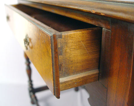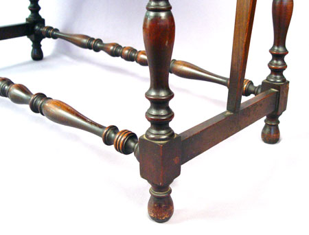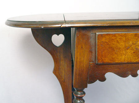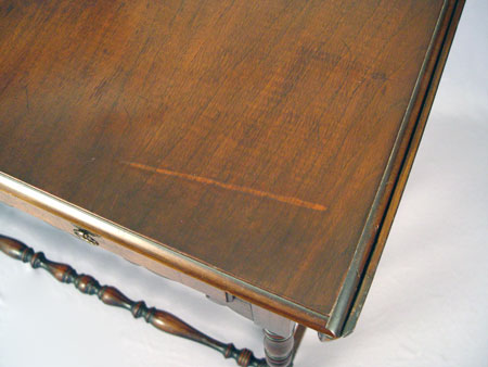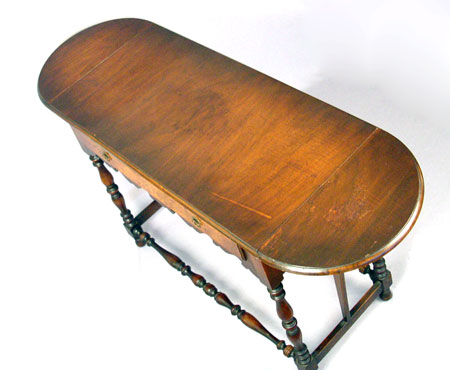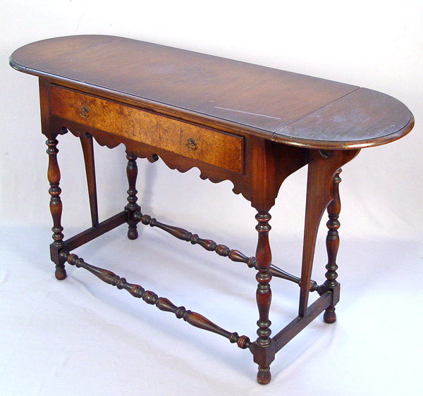 LENOX SHOPS WILLIAM AND MARY STYLE HALL TABLE: Burled walnut drawer, turned legs and stretchers, rounded drop leaves extend the length to 44''. Lenox Shops was an early industry in Conestoga, New York from 1893-1930's. 30 1/2''h., 36 3/4'' x 17 7/8''.