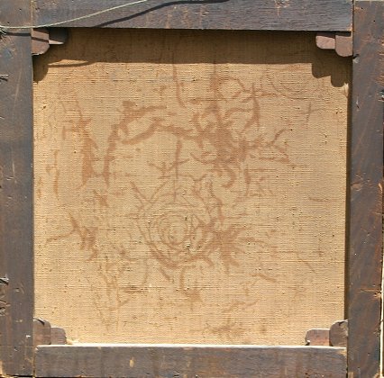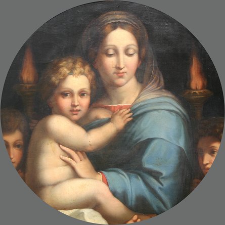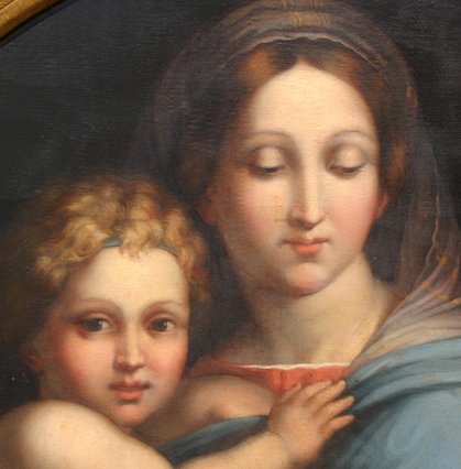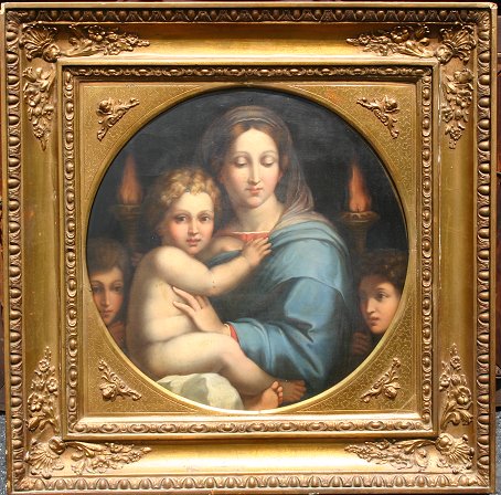 19th C OIL/CANVAS PAINTING OF ST CATHERINE & BABY JESUS: 18'' x 18'', no visible signature, encased in heavy gilded carved and gesso frame with minor wear, 26'' x 26''. Needs cleaning, several minor abrasions.