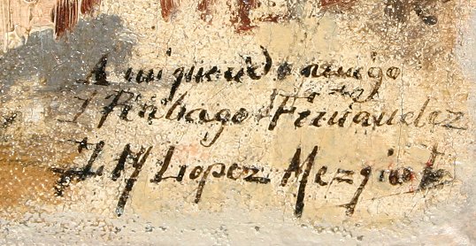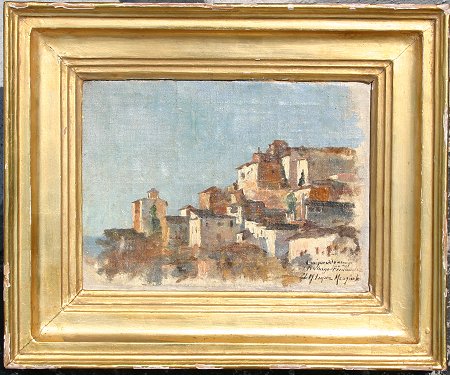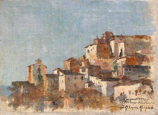 MEZQUITA, Jose Maria Lopez, (Spanish, 1883-1954): ''Albaicin'', Oil/Canvas laid down on Board, 7 1/2'' x 10 1/4'', signed and dedicated to his friend Mr. Fernandez, encased in worn original gilded frame, 12 1/2'' x 15''. Some bubbling of the canvas off the board, several spots of in-paint in the sky.