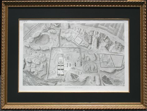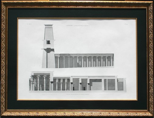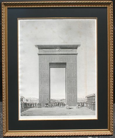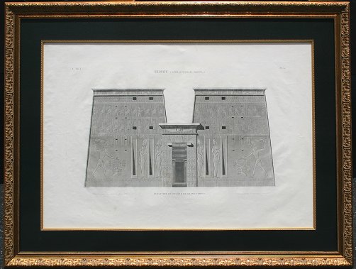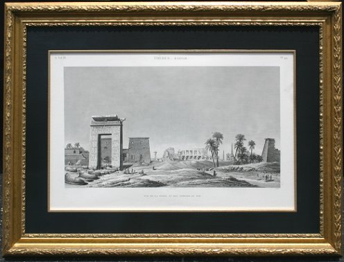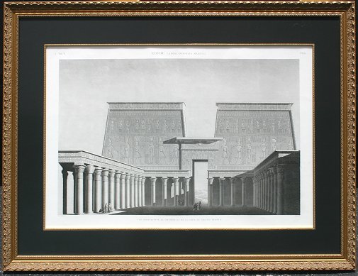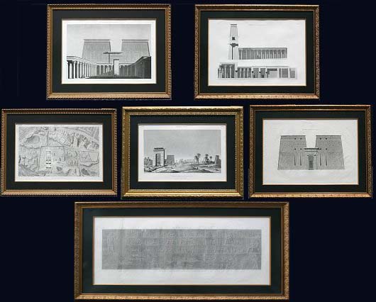 SET OF 6 EARLY IMPORTANT FRENCH ENGRAVINGS OF EGYPT COMMISSIONED FOR NAPOLEON: Three Edfou plates, sight size 25'' x 37 1/2'', archively framed and matted, 36'' x 48''. Three from Thebes, Karnak; View de la Porte et de Temples du Sud, sight size 21'' x 33'', archively framed, 34'' x 46''; Plan Topogiaphique des Ruines, 24'' x 37'', archively framed, 35 1/2'' x 49''. One view of El Kab, (Elythya), ''Bas-Relief Sculpte Sur L'Une De La Grotte Principale'', sight size 22 3/4'' x 27 1/2'', archively framed and matted, 33'' x 58 1/2''. Several of the prints show minor foxing and discoloration. All under UV glass, ready to hang on your wall.
