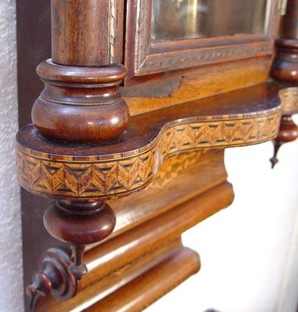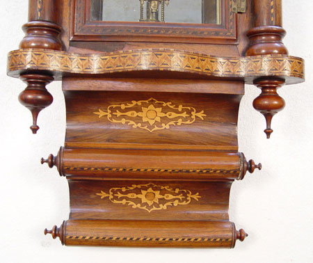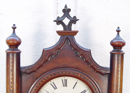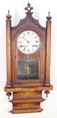 INLAID PILLAR WALL CLOCK: Circa 1880's-1900 American wall clock, inlaid veneer wood case. Pillar columns on door have string inlay with parquetry inlay on bottom scrolls and bottom border. Painted metal face with Roman numerals. Key and pendulum. Cathedral pediment. Measures approx. 42'' high x 18'' wide x 7'' deep. Please note chips to veneer and chips to metal face behind wood case.