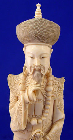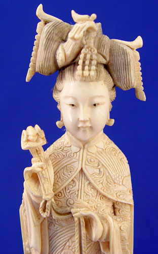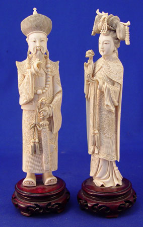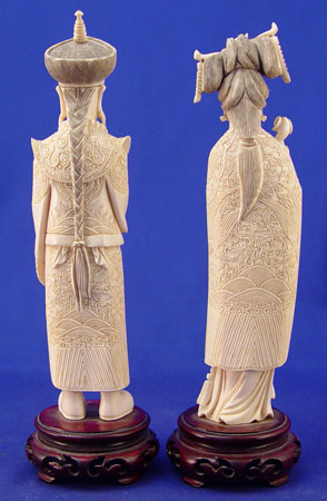 TWO CARVED IVORY CHINESE FIGURES: Man and woman. Man in ceremonial dress holding sword. 8 1/4'' high on rosewood stand 1'' high. Woman in ceremonial dress holding scepter. Measures 8'' high on 1'' rosewood stand. Both made from one piece of ivory and unsigned.