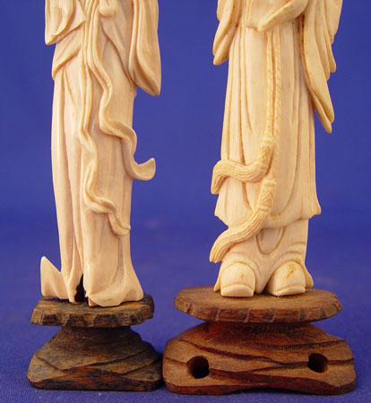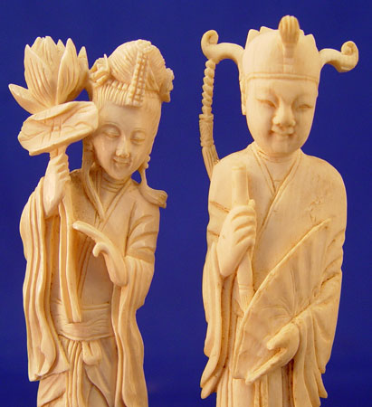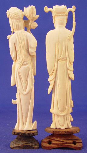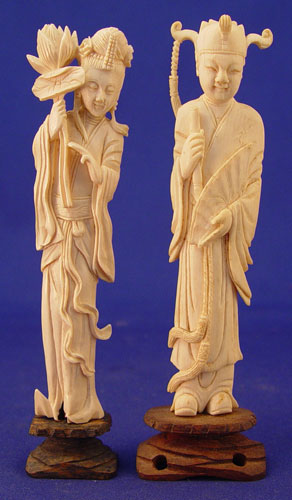 TWO CASED CARVED IVORY FIGURES: Man and woman. Man in ceremonial dress holding staff. 6'' high on 3/4'' wood stand. Woman in ceremonial dress with lotus flower. 6'' high on 3/4'' stand. Both are carved from one piece of ivory and unsigned. Come in domed glass top cases 8 1/4'' high x 4'' dia.