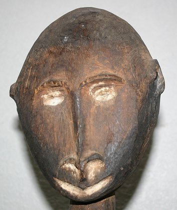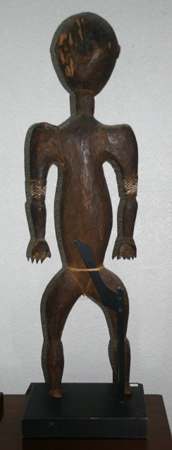 FULL BODIED MALE FERTILITY CARVING: 33''h., unknown variety of wood, affixed to painted wood plinth by a metal rod and screws. Please note a few spots of damage to his head visible verso.