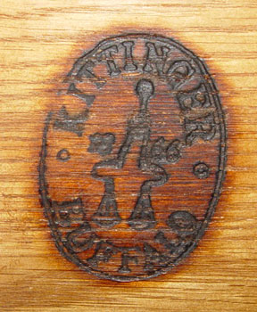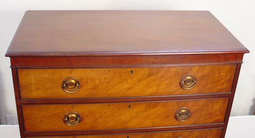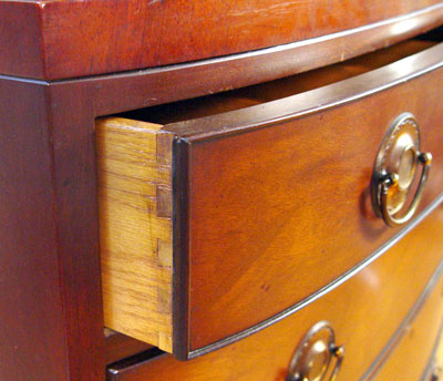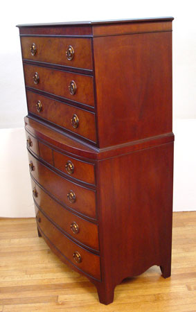KITTINGER MAHOGANY CHEST ON CHEST: 3 straight front drawers recessed over 4 bowfront drawers. Drawers have removable dividers. Branded Kittinger Buffalo. 59'' high x 38'' wide x 20'' deep.