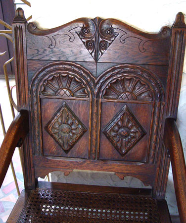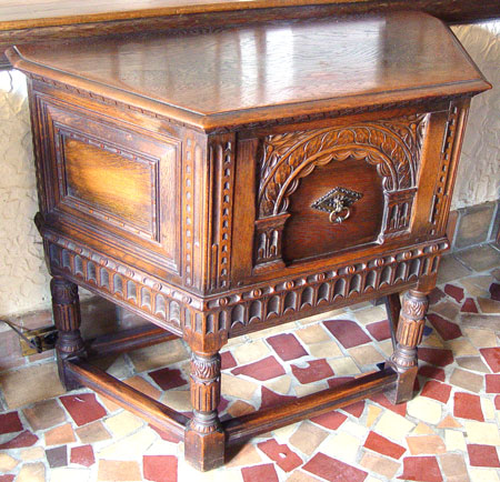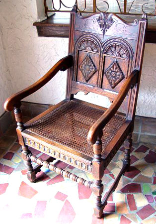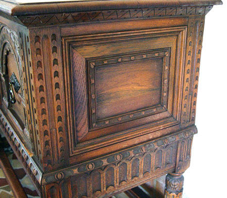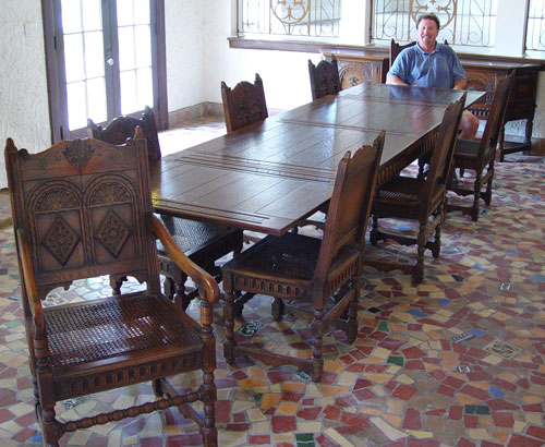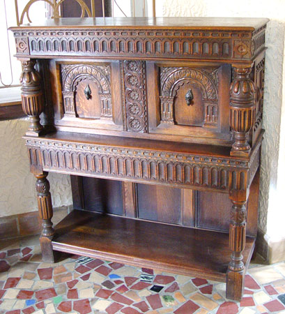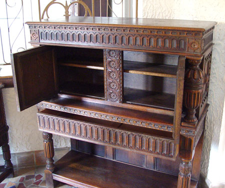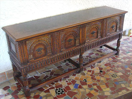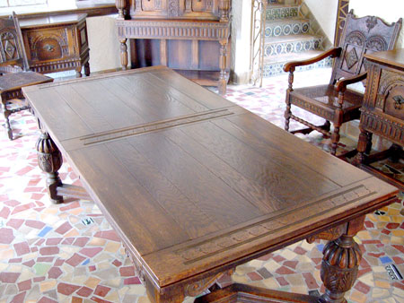 13 PIECE KITTINGER CARVED OAK DINING SET: Jacobean style carved oak, with the brass Kittinger labels. 10 pieces to include draw TABLE with substantial carved legs and apron, 31''h. x 39 1/4'' x 80'' long plus the 30'' each leaves. 8 CHAIRS with solid backs and caned seats, 2 are with arms, they are 43''h, x 23: x 20'', side chairs are 40'' h.; SIDEBOARD, the front being two deep drawers, 36''h. x 84'' x 21 1/2''. CHINA HUTCH with blind storage, 54 1/2''h. x 48 1/2'' x 17 3/4'', and a pair of SIDE CABINET SERVERS, 34 1/2'' x 42 1/2'' x 20''.