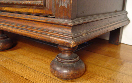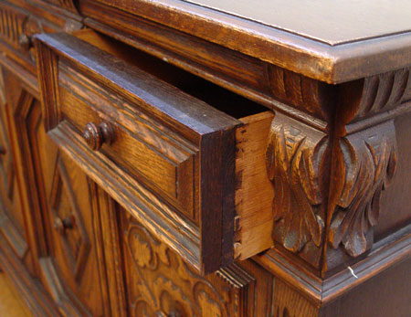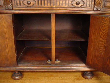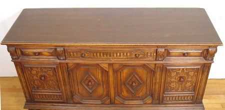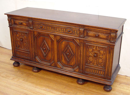 EARLY 20TH CENTURY SPANISH STYLE OAK SIDEBOARD: 3 drawers over 4 cabinet doors. Carving on all front surfaces. 35 1/2'' high x 67'' wide x 21 3/4''