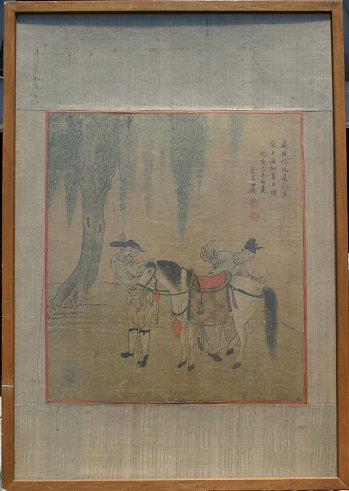 VERY EARLY ORIENTAL PAINTING ON SILK OF MOUNTED TRAVELERS IN A LANDSCAPE: Watercolor on Silk laid down on board, image size 17 1/2'' x 15 1/2'', signed upper right, red chop marks visible, framed, 30'' x 21''. Laid down, several visible tears with missing fabric.