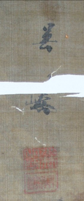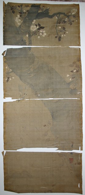 VERY EARLY ORIENTAL WATERCOLOR PAINTING ON SILK: Blossoming Tree Branch with Bird, four separate segments, unframed and un-stretched, overall 38'' x 16'', signed. Sold as is.