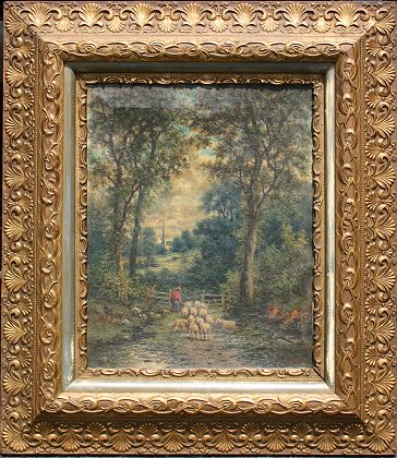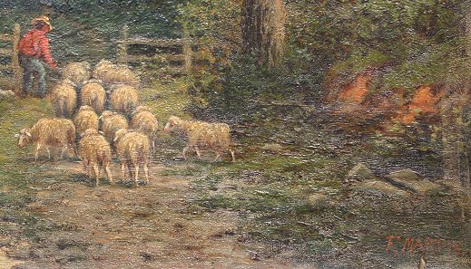 20TH CENTURY LANDSCAPE PAINTING WITH SHEPHERD AND FLOCK OF SHEEP: Oil/Canvas, 20'' x 16'', signed F. Martin, encased in period gilded frame with wear, 32'' x 27 1/2''. Needs cleaning, several areas of paint flecks and needs to be strip lined.