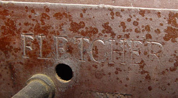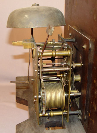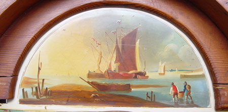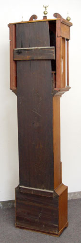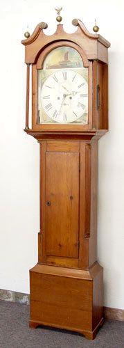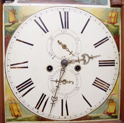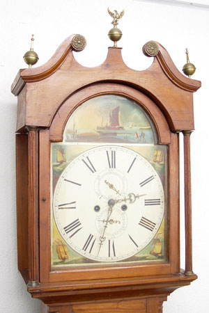 LATE 1700'S PENNSYLVANIA CHERRY TALL CASE CLOCK: Hand painted metal face with maritime motif and roman numerals. 3 separate dials for hour, minutes, seconds. Weight, key and pendulum movement. Cherry wood case with fluted columns top, 1/4 fluted columns along side and scroll pediment. 3 brass finials with spread wing eagle atop center finial. Marked on works Fletcher. Measures approx. 7' high x 19 1/2'' wide x 10'' deep.