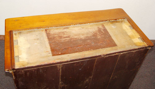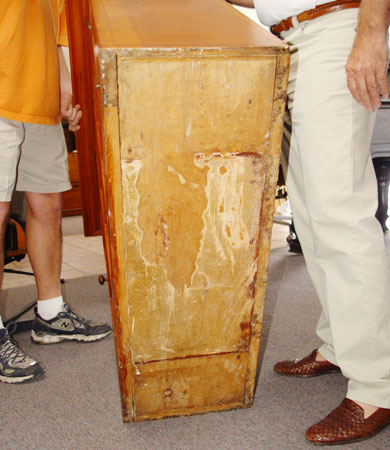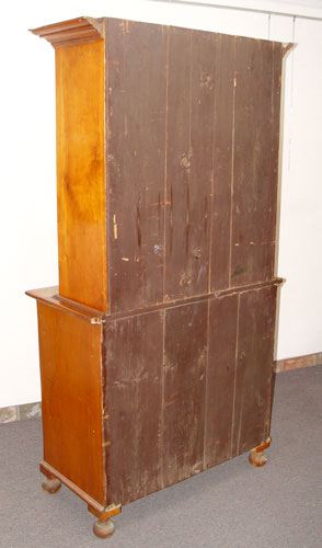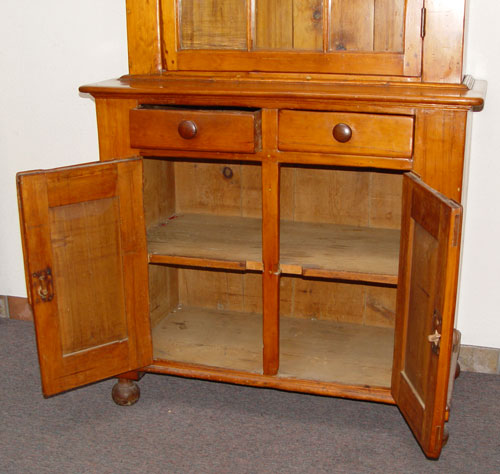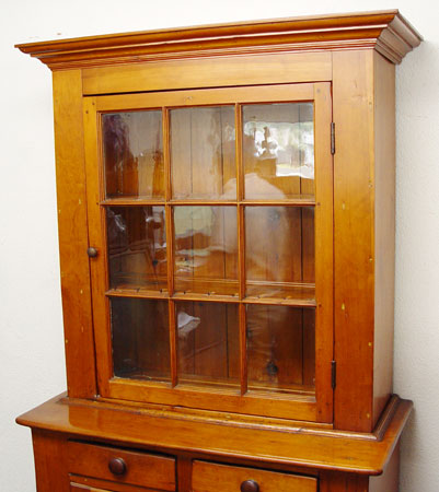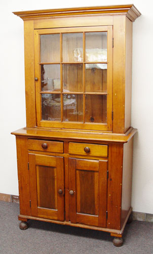 LATE 1700 PENNSYLVANIA STEP BACK CUPBOARD: 2 part cabinet. Upper section with interior shelves with plate grooves and spoon notches. 9 individually glazed panes in the door. One glass is cracked. Lower section with 2 drawers over cabinet doors. Bun feet. 79''h. x 41'' x 21 3/4''.